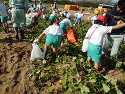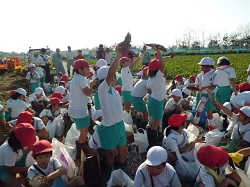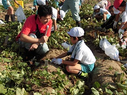 説明を聞いて早速いものつるをみんなで引っ張りました。たくさんの「かほっくり」が土の中から出てきて、子どもたちは大喜びでした。それぞれ抱えきれないほどたくさんのいもを持って帰りました。
