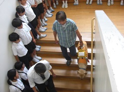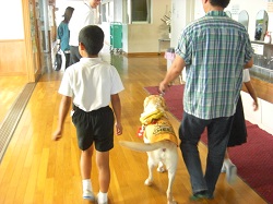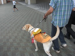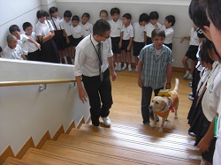 主に西さんの日常生活や盲導犬の役割などについて30分近く質問をさせていただきました。その後、盲導犬が階段で西さんを誘導して上り下りする様子を観察させてもらい、スムーズな歩行ができることに驚いたり感心したりしていました。