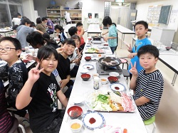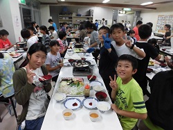 5年生の合宿1日目、入所の集いの後は、夕食です。陶板焼きということで、バーベキュー感覚でわいわい楽しく食事をします。