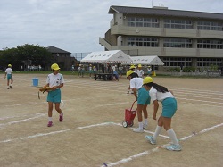 低・中・高学年ごとに、団体競技を行いました。1,2年生は「ポンポン玉入れ」3,4年生は「ぐるぐるタイフーン」、5,6年生は「紅白騎馬合戦」でした。