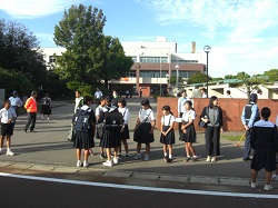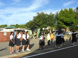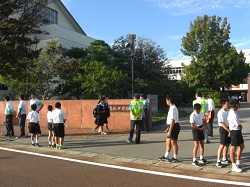 児童は、いつもの場所とは異なり、やや緊張気味で声が出にくいようでしたが、中学生に向かって「おはようございます」と声をかけ続けていました。