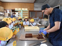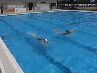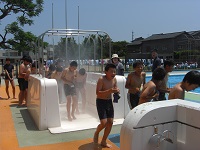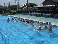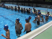 続いて、準備運動を行い、模範泳法を披露してもらった後に一斉に入水しました。児童は大きな歓声をあげながら水の感触を楽しんでいました。