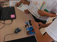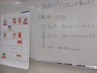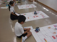 今回は、市の依頼で地元IT企業であるPFUから講師を招いて、シールプログラミングに挑戦しました。車型ロボットにあらかじめ指示を記憶させて、買い物のルートを条件通り正しく回るようにするものです。誤った指示を記憶させると、ルートを外れてしまい考え直さなくてはなりません。児童は、試行錯誤を繰り返しながら次第に指示通り動かせるようになっていきました。
