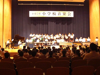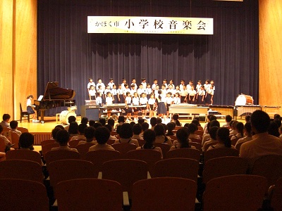 第1回かほく市小学校音楽会が開催されました。本校から、5年生が参加し、プログラム最終校として合奏曲「おどるポンポコリン」と合唱曲「いのちの歌」を披露しました。