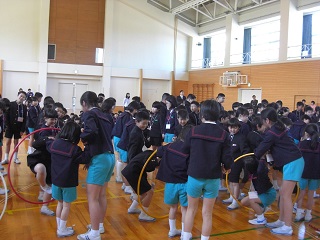 その後、児童集会を行いました。今年のスローガンは「笑顔あふれる高松っ子」です。早速縦割りのなかよしグループでフラフープを使ったゲームで親睦を深めました。また、今月の歌も委員会の素晴らしい演奏とともに元気よく歌えました。