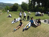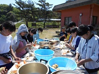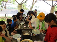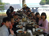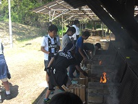 2日目の午前です。朝の9時から昼のご飯作りです。カレーライスなのでみんなやる気満々です。かまどで火をおこすところからやります。これをやると、炊飯ジャーやコンロのありがたみが身にしみて分かります。煙に目をしばしばさせながら、煮炊きを行いました。米を洗って鍋でご飯を炊き、野菜をきざんで炒めるのも全て自分たちでやりました。家族のありがたみがぐっとアップします。それにしてもよく頑張りました。たくましく見えました。