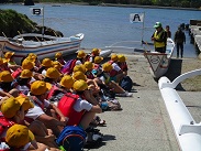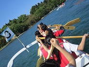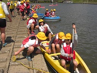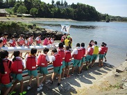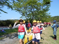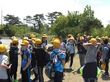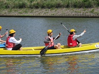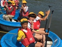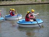 その後、最後の活動として河川活動を行いました。近くの九里川尻川で、2種類のボートをパドルで操りながら進めました。回転したり、左右に揺れたりしながら、徐々に安定したこぎ方を身に付けていきました。