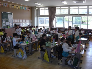 7時から「朝の集い」です。穴水町の穴水小と向洋小と合同で、ラジオ体操、学校紹介を行いました。代表児童が高松と高松小のよさをうまく伝えることができました。