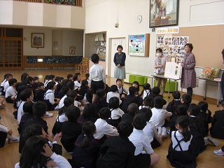 今朝は、玄関ロビーで学校司書の向先生による1年生の読み聞かせ会があり、どの子も真剣に聞き入っていました。