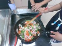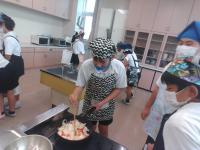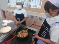 6年生は,家庭科で朝食の役割を学び,いためる調理で手軽にできる朝食のおかずを作る学習をしています。今日は6年1組が調理実習を行い,野菜いためを作りました。材料に合った野菜の切り方や,火の通りにくいものから炒めることなど,ポイントを確認しながら,グループで楽しく調理していました。どのグループも均一に火が通っていて,おいしい野菜いためを作ることができました。