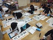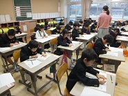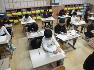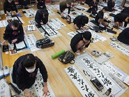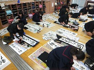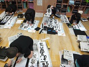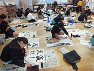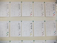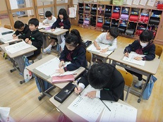 低学年の書き初めは硬筆です。教えていただきながら一生懸命練習しています。