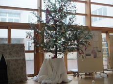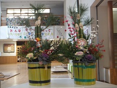 高松小学校の玄関ホールには、地域の方に教えていただきながら作ったクリスマスツリーと門松が飾られています。