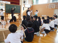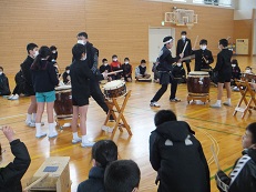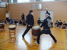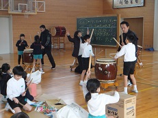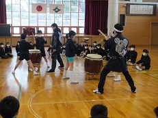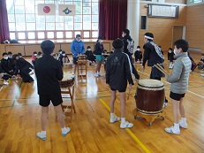 地域からお二人の太鼓の先生に来ていただき、太鼓のたたき方やリズムの取り方などを楽しく教えていただきました。