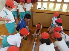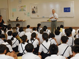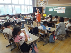 一年生は、養護の溝口先生にどんな所がきちんと磨けていないかなど、正しい歯の磨き方を教えてもらいました。