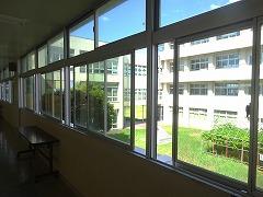 (1)2、3階の中庭に面した廊下や手洗い場の窓等に、転落防止のストッパーを設置しました。換気に必要な分だけ開閉します。