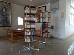 ・図書館前のスペースに「まんがコーナー」が設置されました。読書に抵抗のある人も、まず「まんが」から図書館に来てほしいとのことです。(写真下段左)