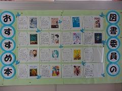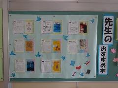 ・図書委員と先生方の「おすすめ本」の紹介です。掲示の下には、紹介された本貸し出しできるように置いてあります。この日は、すでに何冊か貸し出し中でした。(写真下段中・右)