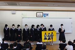 朝読書の時間を利用して、2年生学年プログラム委員会による集会が開かれました。今年度の2年生の学年目標「初心を貫け ~一人一人が決めたとこまで走り抜こう」が発表されました。2年生全員にクロムブックを使って、意見を募集し、決定しました。2年生は、1年生と3年生をつなぐ「学校の柱」です。ぜひ、素敵な目標に向かって走り抜けてください。学年目標のポスターを作成してくれたのは、創作部の皆さん(写真中央)です。創作部の皆さんは、1年生、3年生のポスターも作成してくれました。ありがとうございました。