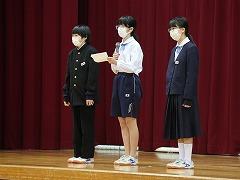 続いて、認証式が行われ、校長より生徒会役員、専門委委員長、学級代表に任命証が手渡されました。この任命証には、先頭に立って頑張ることを決意したことへの感謝と、これからの活動への期待が込められています。全校で応援していきましょう。