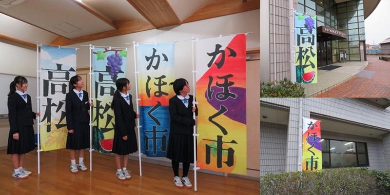 1年生はFT(総合的な学習の時間)において、「かほく市」を大きなテーマとして、あらゆる角度から「かほく市」について探究活動を行いました。その学習も踏まえ、美術科の授業で「かほく市」「高松」のイメージを「のぼり旗」として表現しました。それぞれの作品は、かほく市らしさ、高松らしさを、モチーフ、色彩、背景、フォントを工夫することで表現しています。(12月21日にこの欄で掲載しています)生徒作品の中から4作品が、実際に大きな布地の「のぼり旗」となってかほく市内の施設に展示されます。この巡回展は2月1日から3月29日までの日程で、高松地区を中心に市内6か所で行われます。現在は、高松産業文化センターに展示されています。今後の巡回予定は、こちらをご覧ください。コミュニティ・スクールだより 第8号.pdf