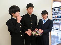 12月に、この欄でも紹介した2年生の美術科の授業で制作した「四季を表す創作和菓子」のうち12作品が商品化され、高松地区内の2店舗で販売が開始されました。店頭で販売されると同時に、店舗内では、生徒が樹脂粘土で作った作品も展示させていただいています。よろしければ、お買い求めください。