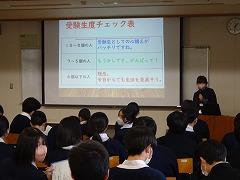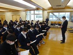 明日から高校の推薦入学試験が開始されます。高松中学校の先陣を切って受験する生徒への激励会(事前指導)が行われました。校長先生、3年生所属の先生方から、「緊張するのは、どの受験生も一緒です。高松中学校から推薦されたことを自信として、気持ちを強く試験に臨んでほしい」と、激励の言葉がかけられました。明日、自宅を出る頃は雪混じりの予報が出ています。ぜひ、時間と心に余裕をもって出かけてください。高松中学校の全職員が、皆さんの合格を信じています。
