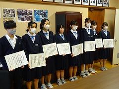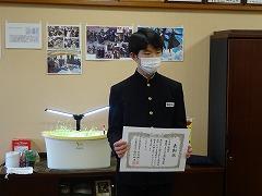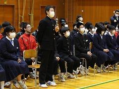 午後からは大掃除、終業式、全校集会が行われました。表彰披露では、河北郡市中学校書写作品展で優秀賞を受賞した皆さん、また、本校が「石川県良い歯の学校運動」において優良賞を受賞したことにより、代表で保健体育委員長の 鍛治澤 市人 さん(3の2)が賞状を披露しました。