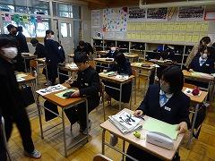 1年のうちで最も長い2学期も、最終日を迎えました。今日は午前中に、冬休み中の学習・生活の話を主とした学年集会が行われました。(写真上段)さらに1年生は「はたらくすがた」写真コンテストの表彰、2年生は、学年プロ委による1月の取組の説明、3年生は、入試当日のスケジュールで学習するなど学年独自のお話もありました。
