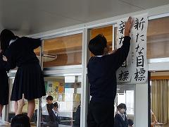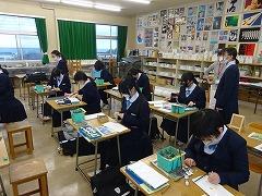 全学年、冬休みの宿題に書き初めがあります。1年生「不言実行」、2年生「新たな目標」、3年生「旅立ちの春」を書きます。写真上段は3年2組の国語科(習字)の授業のようすです。文字通り、まもなく「旅立ちの春」を迎える3年生です。息を止めて、丁寧に書いていました。