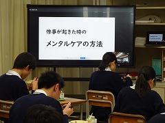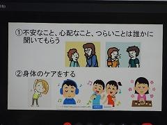 今日は給食の時間に、養護教諭の橋本先生より「初期のメンタルケア」についてお話しを聞きました。お話しの中では、以下の対処方法6点と、その具体的な内容が紹介されました。また、「自分に合った方法を見つけ、スキルを身につけましょう」とのお話もありました。