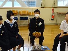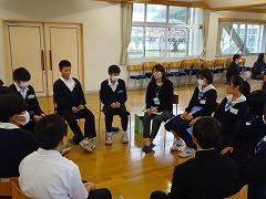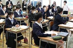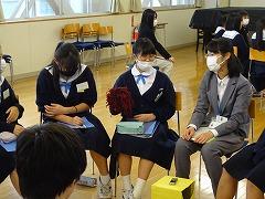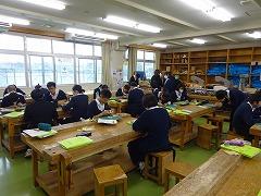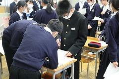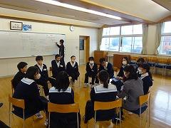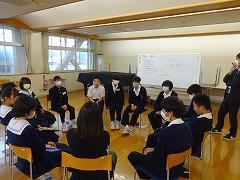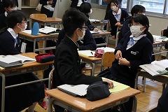 7日(火)に西田幾多郎記念哲学館を訪問した2年生、今日は哲学館から学芸員の方をお迎えし「哲学対話」が行われました。写真は4限目に行われた2年1組のようすです。3クラスとも同じ内容で実施しました。各クラス2グループに分かれ、自分たちが選択したテーマについての思いを話しました。中学生の意見を聞いて、学芸員の方が違う角度から質問したりして、さらに考えを引き出していただき、テーマについての答えは出しませんが、思索する1時間となりました。2年生が考えたテーマは「努力をしたら必ずいいことがある」「流行にはのった方がよい」「信頼できる人ってどんな人」の3つです。哲学館訪問と哲学対話が行われた今週は、学校の授業にない「哲学」に触れる経験ができました。