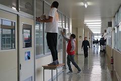 PTA環境委員会主催の「校舎内外整美作業」(2・3日目)が行われました。10日(金)は創作部、11日(土)は野球部、剣道部、吹奏楽部が、部活動ごとに担当区域を分けて、生徒とその保護者が一緒になって、1時間程度、窓ふき、掃き掃除、床拭き掃除をしました。1日目(10月28日)と合わせて、3日間で生徒161名、保護者135名と多数の参加がありました。お忙しい中、ご協力いただきありがとうございました。学校を助けていただける保護者の方が、たくさんいらっしゃることに、ただ、感謝するばかりです。今後も、皆様の気持ちをいただいて、美しくなった校舎を大切に使わせていただきます。