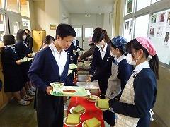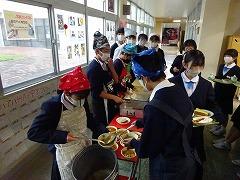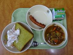 今日のメニューは小松菜パウダーを練りこんだ小松菜パンに、市特産の「紋平柿」の入ったヨーグルトクリーム和えをはさんだフルーサンドです。その他のメニューは「豚輝ウィンナー」のケチャップがらめ、「大崎だいこん」「かほっくり」「れんこん」が入った「かほくのオータムスープカレー」と地場産物が多くありました。特に、高価な紋平柿は、不揃いのためお店には並ばないものを、給食センターの調理員の皆さんがカットしてくださったと聞きました。(月曜日の給食試食会で教えていただきました)地域のことだけでなく、中学生に必要なエネルギーの摂取、栄養バランス、材料費のことなど考えてくださっている給食センターの方々にも感謝の気持ちを持って、美味しくいただきました。