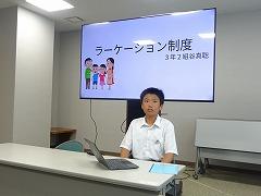 3年生はSDGsを大きなテーマとし、自分自身が貢献できることの提案について探究活動を進めています。今日は谷 真聡 さん(3の2)が、「ラーケーション」について学んだ成果をプレゼンし、市役所の方に提案を行いました。谷 さん が、本校3年生を対象に調べたアンケートでは「家族とともに過ごす機会が、週に1回程度の生徒が8割」「ラーーケーション制度があったら利用したい生徒は6割」とのことでした。かほく市でも認知度を上げるための取組や導入について検討してほしいと提案しました。市役所の方からは、保護者の方々のアンケートや、既に導入されている自治体での効果などを盛り込むと、提案の説得力が上がるとアドバイスをいただきました。学校から離れた場所で発表する活動は緊張したことと思います。今日の貴重な経験を通して、さらに、探究活動をブラッシュアップさせてください。お忙しい中、時間を割いていただいた市役所の方には、ただ感謝するばかりです。