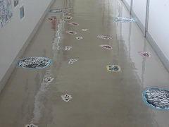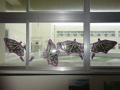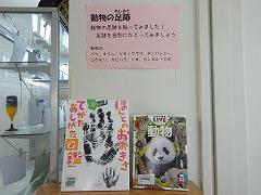 理科室前の廊下にたくさんの「動物の足跡(実物大)」が出現しました。窓ガラスには、コウモリの足跡が、廊下には動物を色別にけて分けて、アフリカゾウ、キリン、カンガルー、リスなどの動物の足跡が貼られています。これらは、図書館司書の 澤野 さんと図書館ボランティアの 梶 さんが「ほんとのおおきさ・てがた あしがた図鑑( 小宮 輝之 著 Gakken 2013 )」を参考につくってくださいました。理科室前が楽しくなりました。