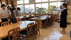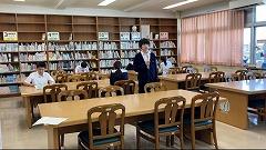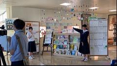 かほく市ケーブルテレビ・図書館番組が、本校の学校図書館を取材に訪れました。図書委員の3年生が、図書館前の「新刊コーナー」、「前期図書委員のおすすめ本」の展示と掲示物、月ごとのテーマによって「特設コーナー(6月は部活動に関連する書籍)」、リラックスして本が読める「畳コーナー」など、図書館内を案内しました。