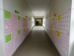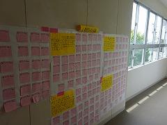 保健体育委員会の6月の取組「ピア・カウンセリング」が完成し、教室棟から体育館へ続く渡り廊下に、全校生徒から寄せられた「ピア・アドバイス」が掲示されました。「ピア・カウンセリング」とは、大人や先生でなく、高中の仲間に相談して解決していく相談活動です。