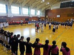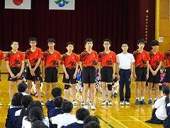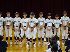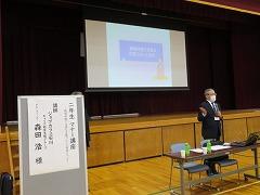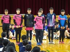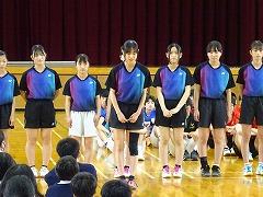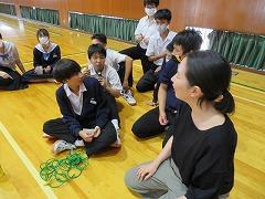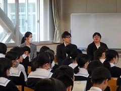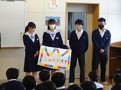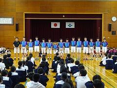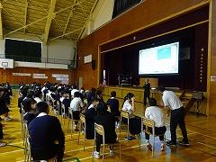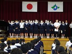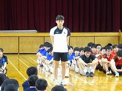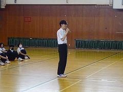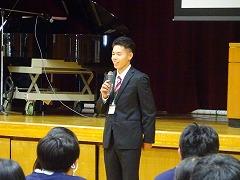 集会の最後には、今日から3週間の日程で、本校で教育実習を行う 嶺蔭 優翔 さん(本校卒業生、写真右下)が自己紹介をしました。嶺蔭 先生は、1年3組と保健体育科の授業を担当します。
