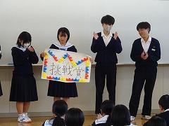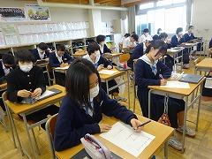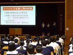 また、今月の重点委員会として、保健体育委員会が「ピア・カウンセリング」を実施します。この「ピア・カウンセリング」は、大人や先生でなく、本校の仲間に相談して解決していく相談活動です。今日は、各クラスで保健体育委員が取組について説明し、仲間に相談したいことや、困ったことなどを無記名で記入しました。この後、保健体育委員は寄せられた悩みをタブレットで打ち直し、相談者が分からないようにします。後日、本校の生徒からの寄せられた悩みに回答する時間が設定されています。きっと解決のヒントやアドバイスがもらえることと思います。互いを気遣う温かい気持ちが、学校中に広がることを期待します。