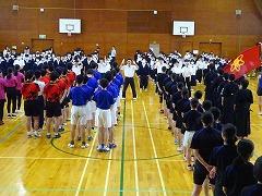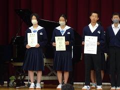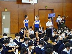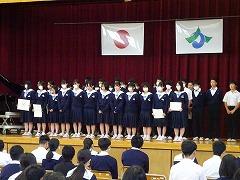 6月の全校集会が行われました。表彰披露では、今月末の県大会へ出場を決めた陸上部3年生の他、河北郡市春季大会で好成績を収めた団体・個人がステージに上がり披露しました。来週から始まる、加賀地区大会での活躍が楽しみです。また、トランポリン競技大会での表彰披露もありました。校外での活動や、個人で出品したコンクール等で優秀な成績を収めた場合、全校集会等で披露しますので学校までお知らせください。