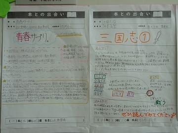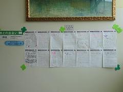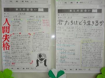 2階から図書館へ続く階段に掲示してある「本との出会い」です。国語科のゴールデンウィークにおける取組として、全校生徒が1冊、みんなに読んでもらいたい本を紹介しました。選んだ本について、書名、著者名のほか、「あらすじ」「登場人物」「読後の感想」がまとめられています。登場人物と自分自身を重ねた感想などが書かれていて、思わず読んでみたくなります。図書館へ足を運ぶ、きっかけとなりますね。