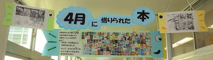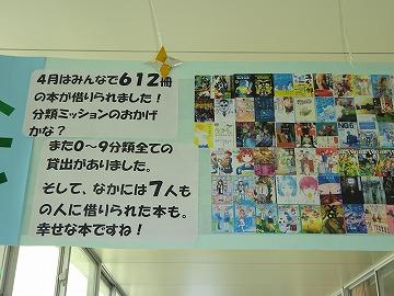 図書館前の廊下に提げられた「こいのぼり」です。4月に借りられた本の表紙が「うろこ」になっているところが面白いです。4月は10分類すべてで、612冊の本が貸し出されたそうです。「本との出会い」の取組をきっかけに、いろいろなジャンルの本にチャレンジしてください。