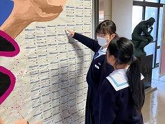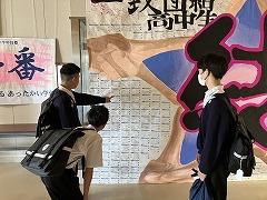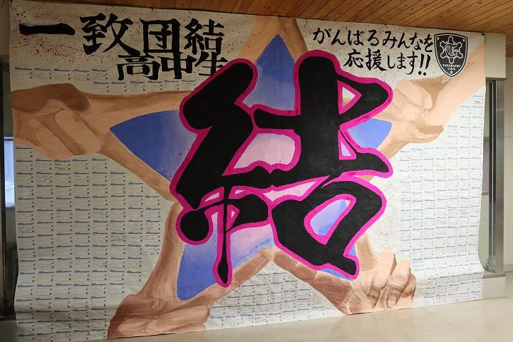 玄関ホールに「がんばる人を応援メッセージ」が玄関ホールに登場しました。2.7m ✕ 4.2m の迫力あるメッセージです。メッセージを見ている生徒と比べると、その大きさが伝わってきます。生徒・教職員全員が今夏の大会・コンクールに向けて書いた「私の今の目標」と「応援メッセージ」を創作部のみなさんが、文字通り「結」んでくれました。創作部の制作のようすと合わせてご覧ください。