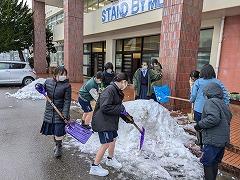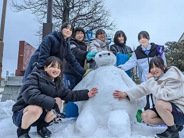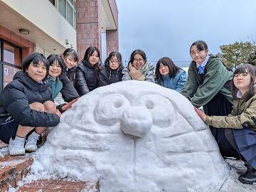 今日は、今年1番の積雪を記録した寒い朝を迎えました。午後からは天気も緩み、創作部の生徒が作った2体の雪像が生徒玄関前に現れました。今年度の生徒会目標「STAND  BY ME」にちなみ、1年生チームは「ドラえもん」を、2年生チームは生徒会目標の意味「一人一人に寄り添う」を連想させるキャラクター「ベイマックス」を完成させました。寒い日でしたが、ほっこりとあたたかい気持ちになりました。