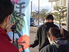 今年度、本物の「のぼり旗」に採用されたのは、丹羽 愛徠 さん(1の1)、森 大晟 さん(1の1)、崎出 ニコ さん(1の2)、宇野 紗梨 さん(1の3)の4名です。今日は、かほく市ケーブルテレビ、北國新聞社の取材もありました。4名は記者の方々に、自分の作品で工夫したところや、表現したイメージをしっかり伝えていました。