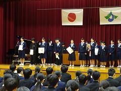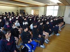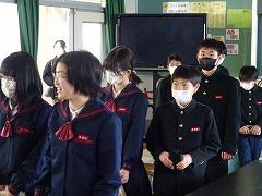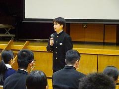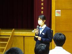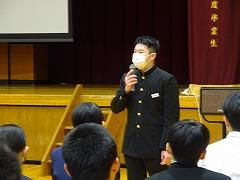 3月の実践目標は「1年間を振り返ろう」です。学習については3年生から、1、2年生に向けて数学、理科、英語の学習についてアドバイスがありました。また、今月の重点委員会、文化委員会からは卒業式に向けて校歌をより良く歌う取組について説明がありました。執行部からは、「清掃」について話し合った生徒総会を受けて、生徒を頑張っている団体や個人の紹介がありました。