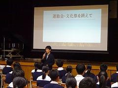 3年2組のみならず高松中学校全てのクラスが、合唱コンクールに向けて取り組んできました。わずかな時間で、クラスが一体となった合唱を作り上げることも難しかったことと思います。また、伴奏者、指揮者はたくさん個人で練習をしたことと思います。先週の文化祭、今日の発表会で「合唱」は一区切りとなりますが、クラスで一つのことに取り組んだという貴重な経験をしました。