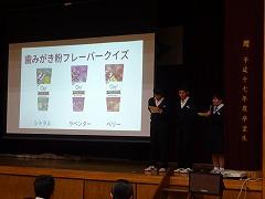 今日から3日間、保健委員会の取組「団対抗歯みがきバトル」が行われます。今日はその1回目でした。給食後の歯みがきをする人が少なくなっていることから、食後の歯みがきの習慣をつけることが目的に実施します。保健委員会が用意した歯みがき粉を全部使用したクラスには得点が、さらに配布された歯みがきのフレーバーを正解すると、さらにポイントが加算される仕組みです。用意された歯みがき粉のフレーバーは「シトラス」「ラベンダー」「ベリー」の3種類です。「楽しく、食後の歯みがき習慣」という、素敵な取組を考えた保険医委員会に拍手です。