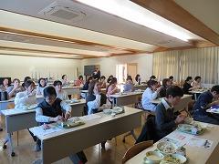 午後は、(株)芝寿し 代表取締役社長 梶谷 真康 氏 を講師にお迎えし「求められる人材とは」と題した講演を聴きました。梶谷 氏 は職員を採用する面接において「幸せになりたいですか」と尋ねるそうです。さらに「どう幸せになりたいか」と問い返しをすると、答えられない人が多くあるそうです。梶谷 氏 は「働くのは幸せになるための手段」であり、自分は自分の人生で何を求めるのか考えることが大切と、お話しをされました。また、講演の中では「will.do,beリスト」を100項目 書き出すワークショップにも取り組みました。100項目 書き出すのは難しいが、1度書くことが止まったときから「自分との対話が始まる」のでチャレンジしてほしいとも話をされました。