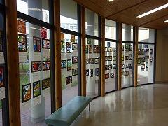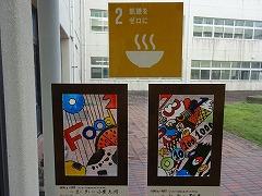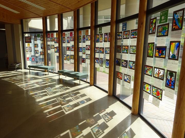 1階 多目的ホール 横に、3年生が美術科で作成した「ステンドグラス」が、飾られました。3年生はSDGsの学習から個人テーマを設定して探究学習を行いました。美術科でもSDGsのテーマから伝えたいことやイメージを色や形に置き換えて、配色や構成を工夫して表現しています。撮影した日の天気は、残念ながら「くもり」。太陽の光が差し込んだ日には、ホールの床に鮮やかな映り込みが現れます。